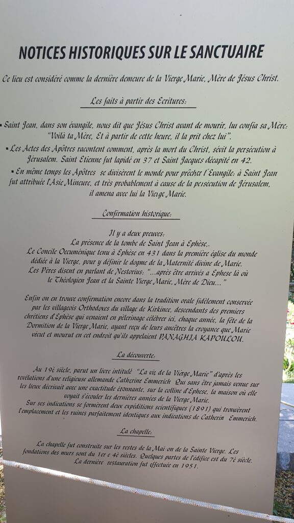 Il reste vrai que la visite de ce lieu où La Vierge Marie a vécu dans le silence et l’effacement les dernières années de sa vie invite au silence contemplatif et à l’humilité… cela nous rappelle aussi l’importance de la terre de Turquie dans l’histoire biblique qui commence en Genèse 12 avec la vocation d’Abraham à Harran (sud-ouest du pays)… et finit encore en Turquie avec l’Apocalypse de Saint Jean par les lettres aux 7 Eglises (Ap 2 et 3).